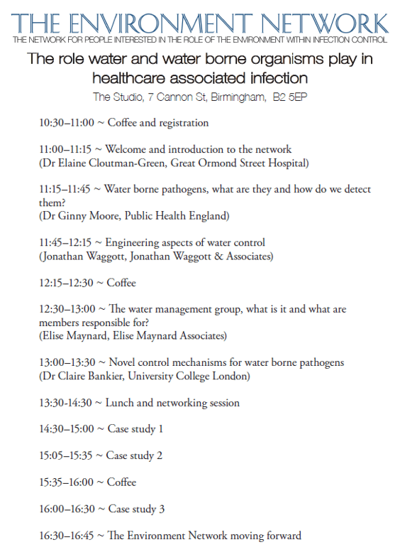 In 2018 the Environment Network responded to the wish to not be London centric by holding the event in Birmingham. That years theme was ‘The role water and water borne organisms play in healthcare associated infection’.